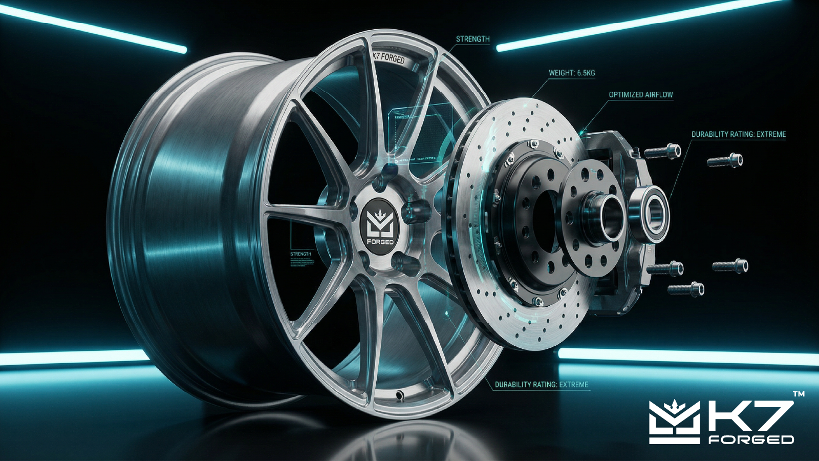 K7 Forged’s scientifically designed racing wheels reduce material at the rim edge and keep strength near the hub and spoke junctions, which allows faster rotation and quicker deceleration.